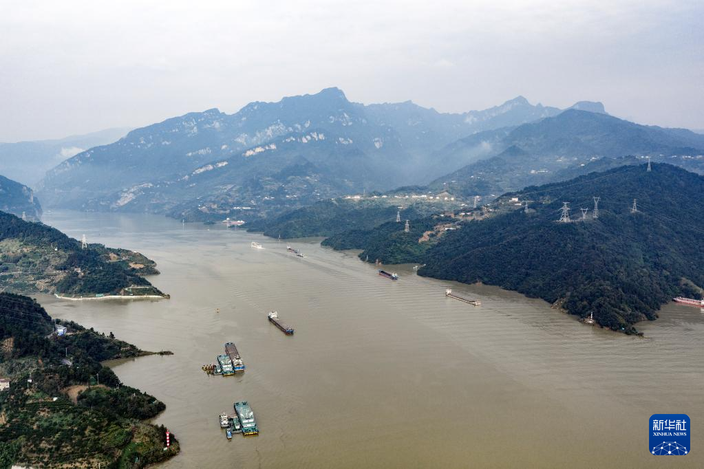 10月24日,船舶行驶在三峡大坝上游的湖北省宜昌市秭归县水域(无人机照片)。新华社发(王辉富 摄)