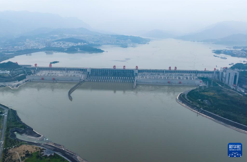 10月24日在湖北宜昌拍摄的蓄水后的三峡大坝(无人机照片)。新华社发(郑家裕 摄)