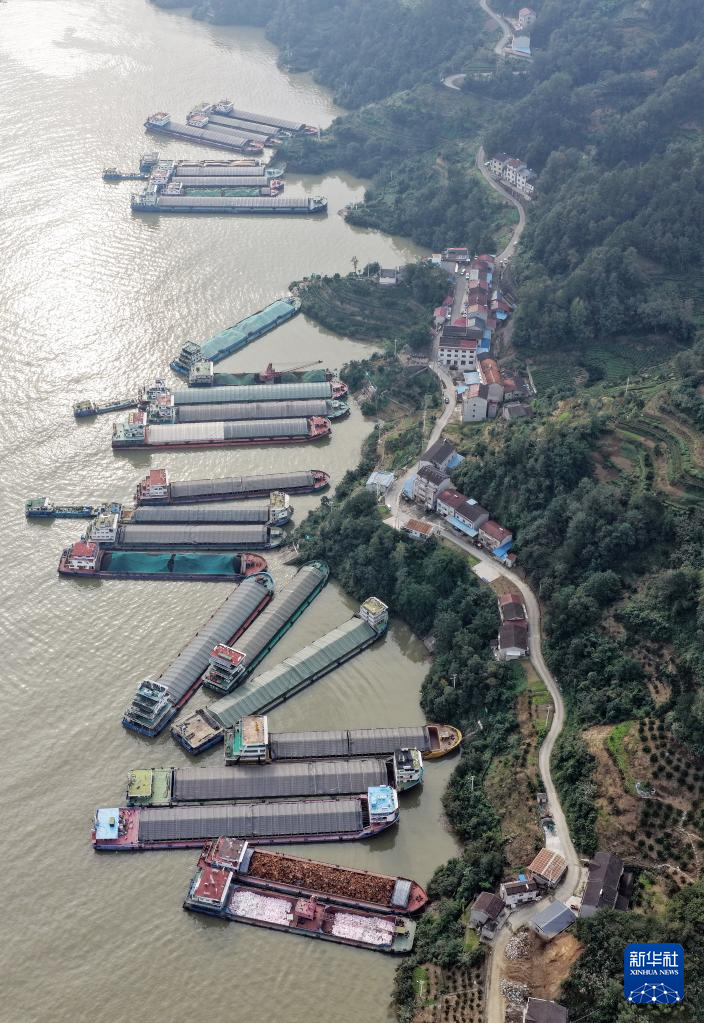 10月24日,船舶停靠在三峡大坝上游的湖北省宜昌市秭归县水域等待过闸(无人机照片)。新华社发(王辉富 摄)
