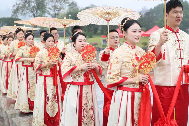 11月6日,湖北宜昌三峡大坝截流纪念园内洋溢着喜庆氛围,“爱满长江 情定宜昌”2025全国青年三峡大坝集体婚礼在此举行。24对来自全国各地、不同行业的新人齐聚大坝之畔,以集体婚礼的形式参加中华传统婚典,开启幸福新篇章。