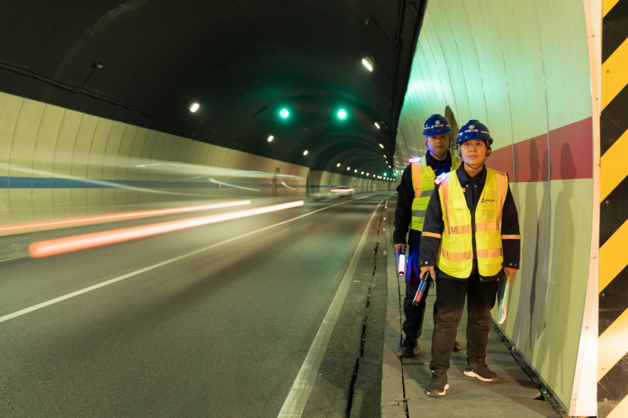 工作人员在三峡专用公路隧道内巡检。摄影:汤伟