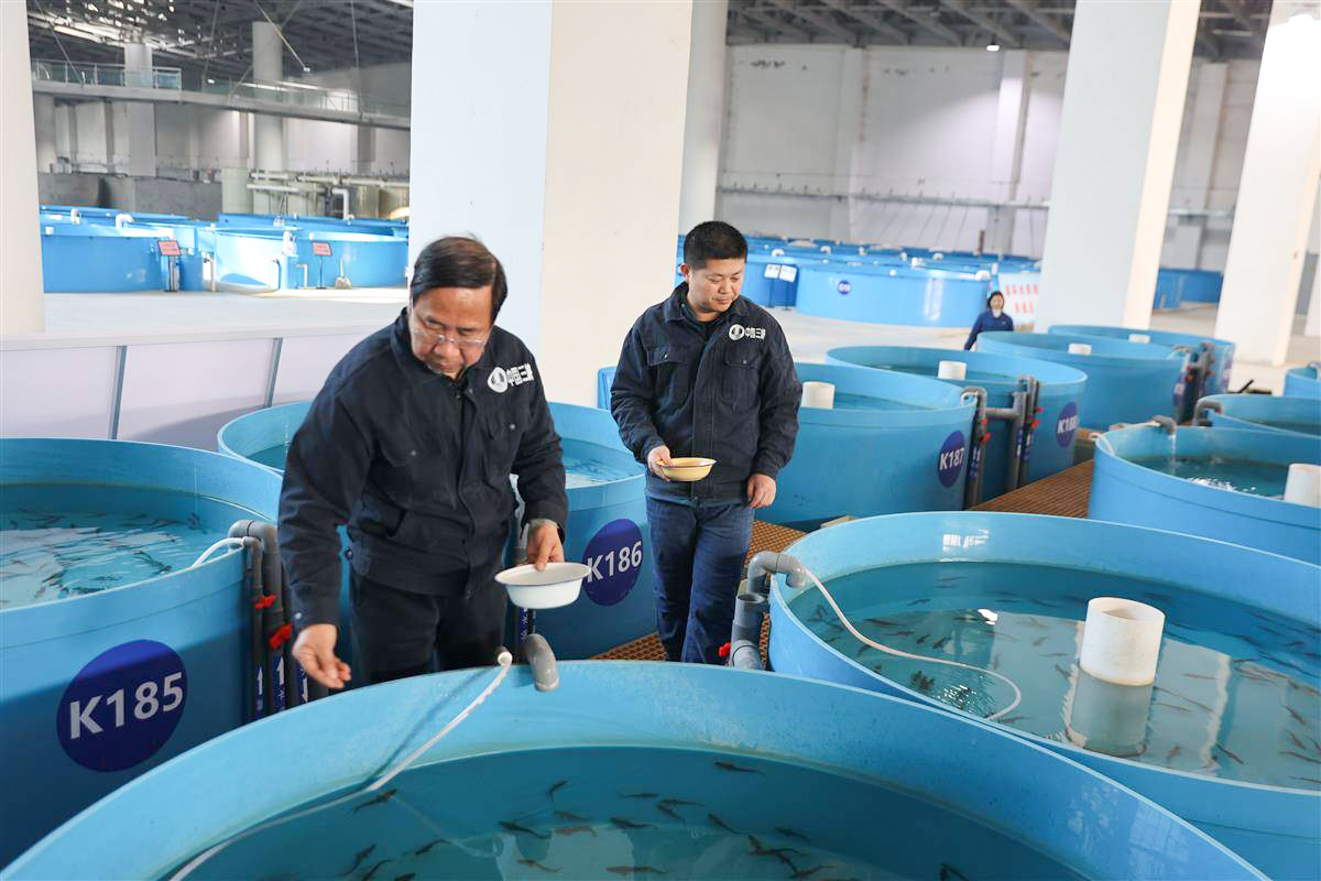 1月13日,在位于湖北省宜昌市的长江珍稀鱼类保育中心2025年11月11日破膜而出的子三代鱼苗已健康成活62天,生长态势良好,技术人员正在投喂中华鲟幼苗。