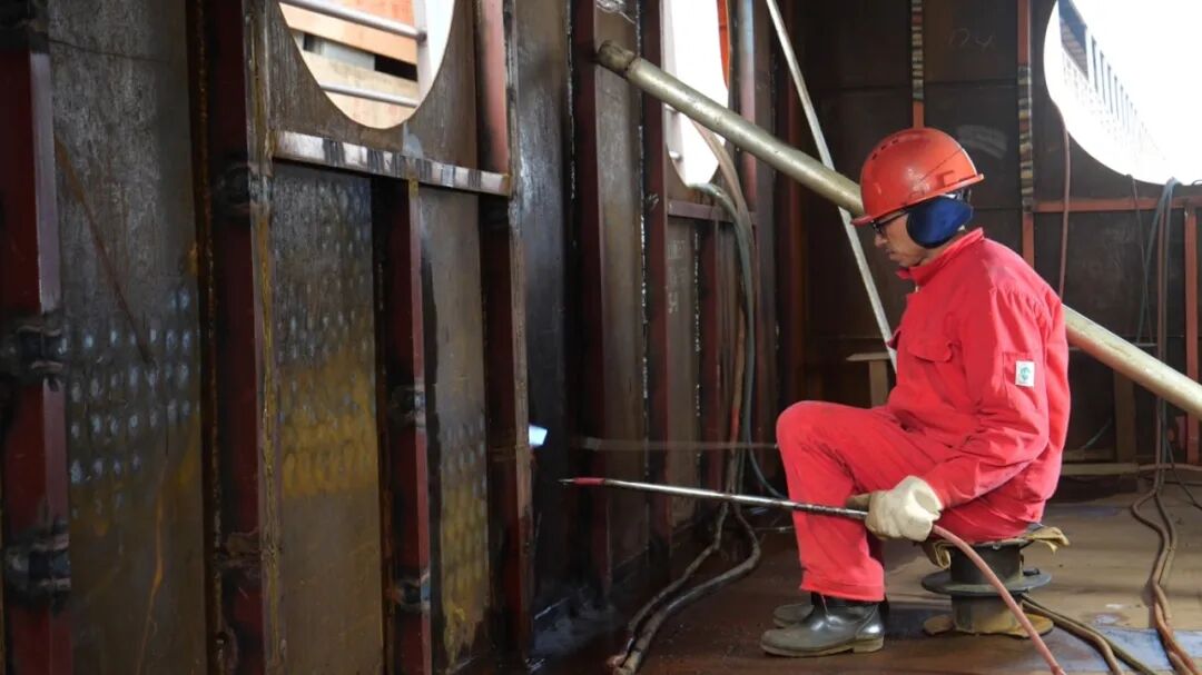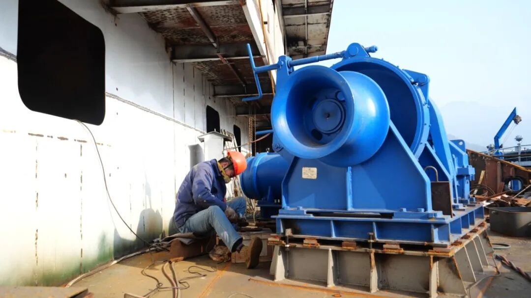 深冬时节,江风凛冽。三峡翻坝物流产业园华星船厂的舾装码头上,却是一派火热景象。一艘总长130米的巨轮静卧江畔,工人们分布在甲板、船舱等区域,进行设备调试、管线安装与内饰收尾等工作。
