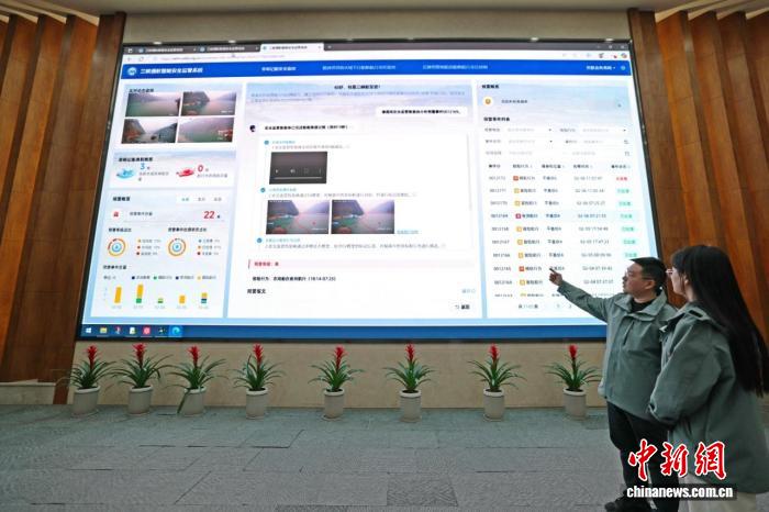 2月6日,长江三峡通航管理局指挥大厅内,调度人员演示“智能眼”应用场景。中新社记者 董晓斌 摄