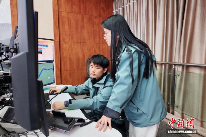 2月6日,长江三峡通航管理局三峡通航指挥中心运行值班主管赵寒寒(右)指挥调度船舶安全通过三峡枢纽航段。中新社记者 董晓斌 摄