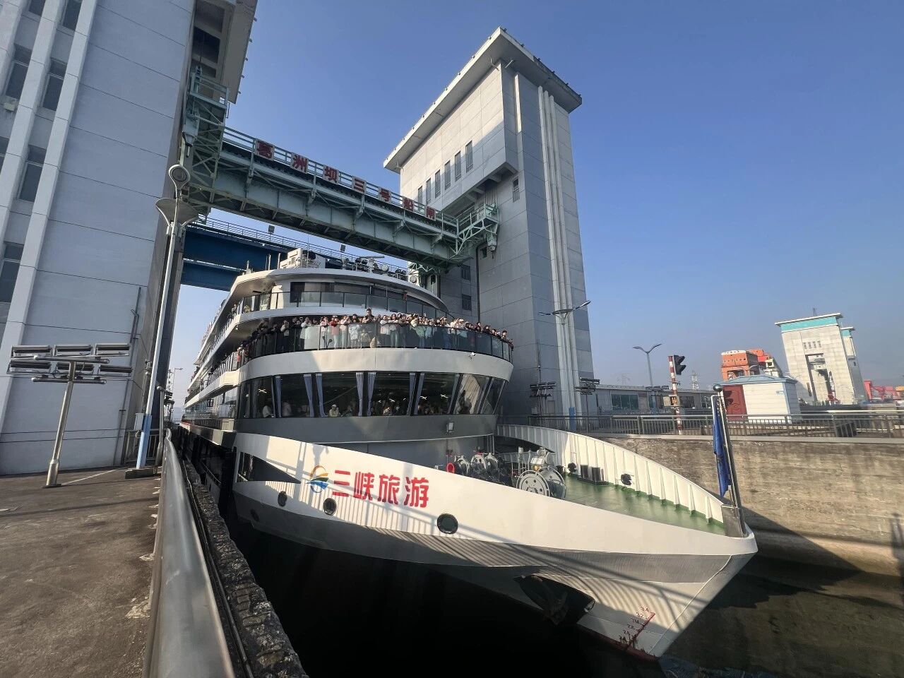 春节期间,三峡枢纽河段客运量持续走高。图为2月21日,船舶通过葛洲坝船闸。摄影:林海