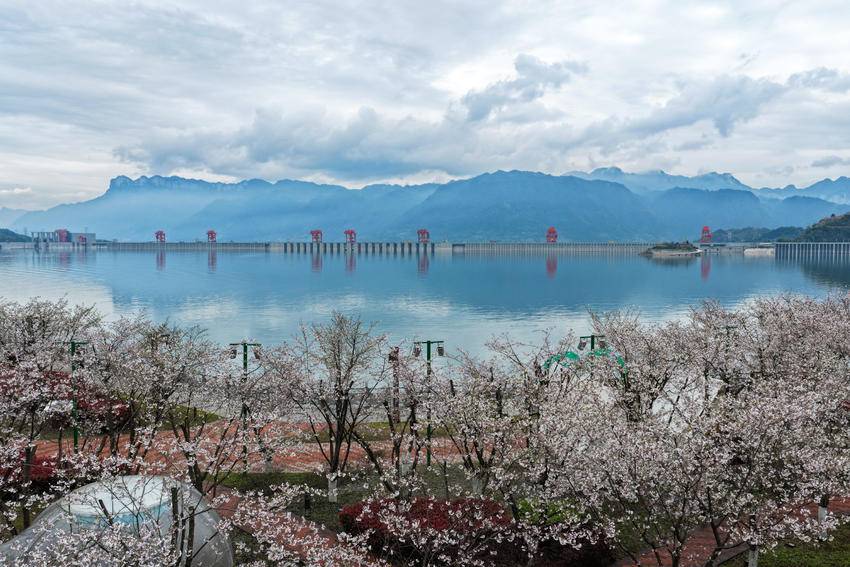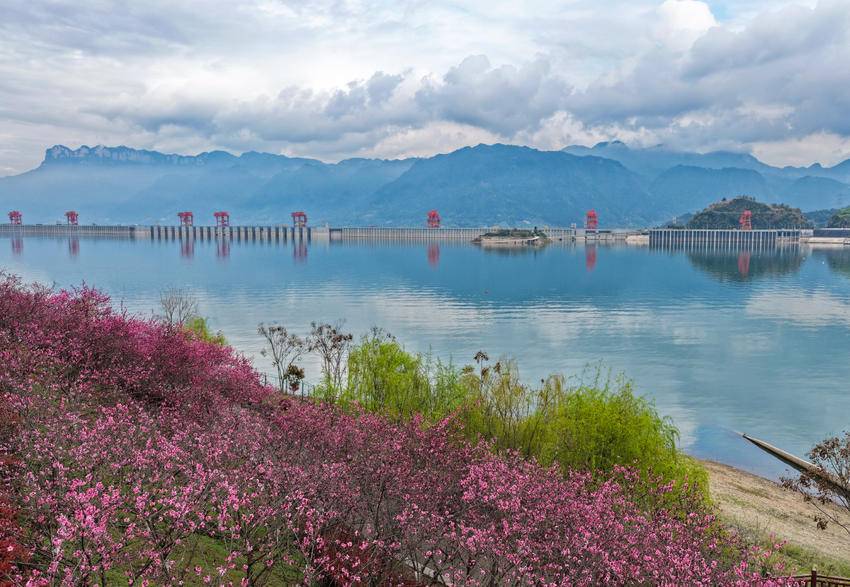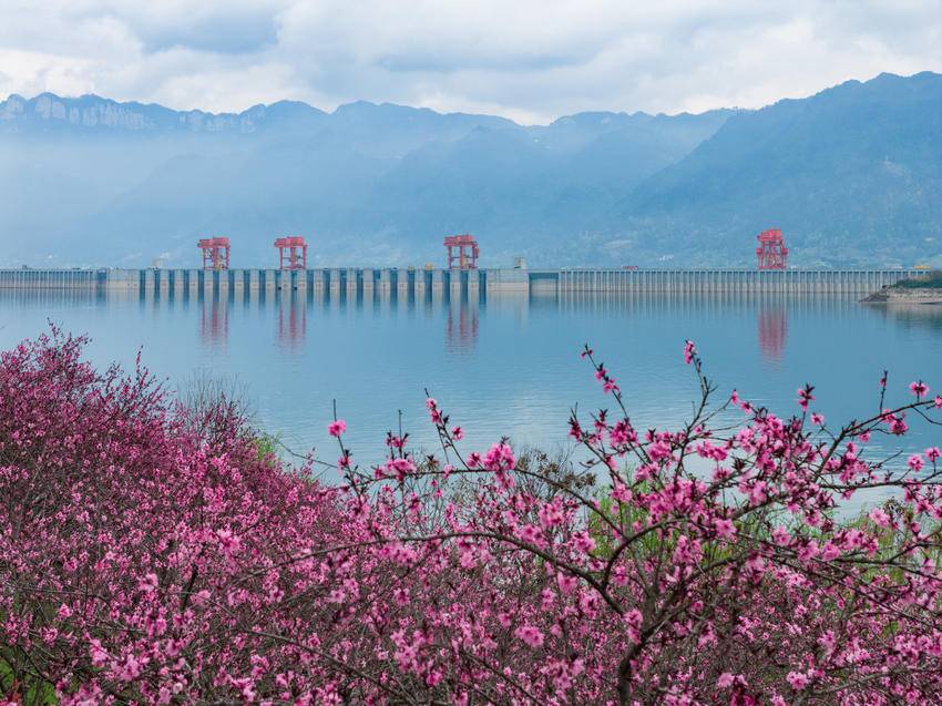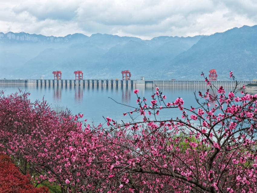 2026年3月26日,湖北省宜昌市秭归县茅坪城区凤凰山上桃花、樱花绽放正艳,浓浓春色将长江三峡大坝装扮得更加雄伟壮丽。(通讯员魏启扬)