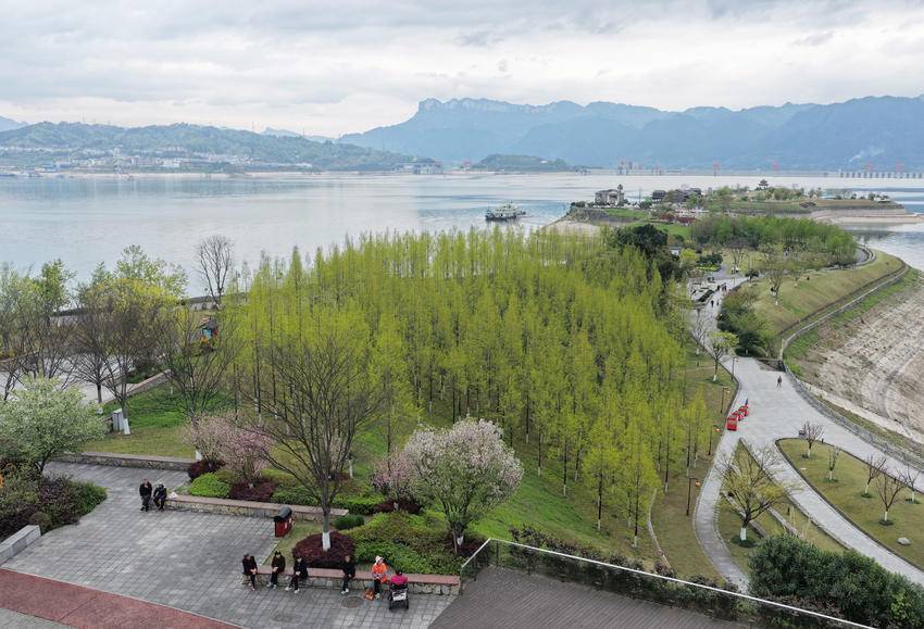 3月30日,人们在三峡大坝坝前湖北省秭归县的滨江游步道休闲游玩(无人机照片)。