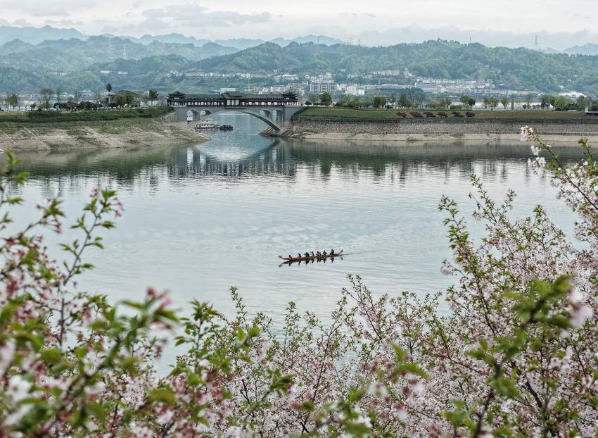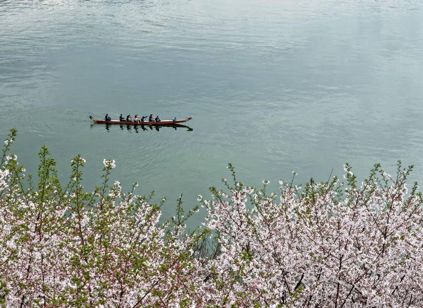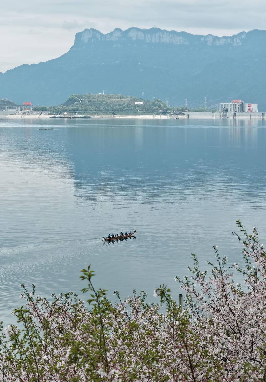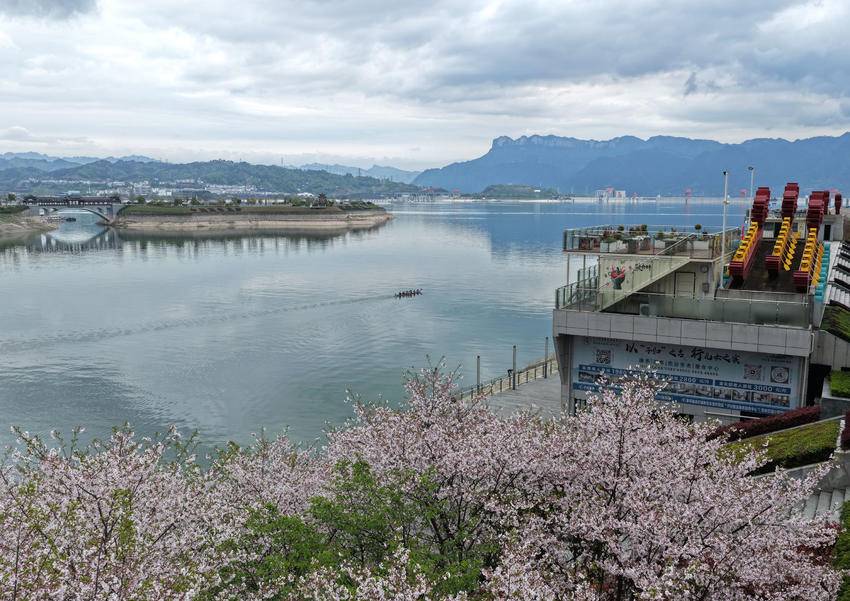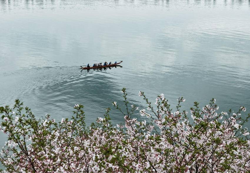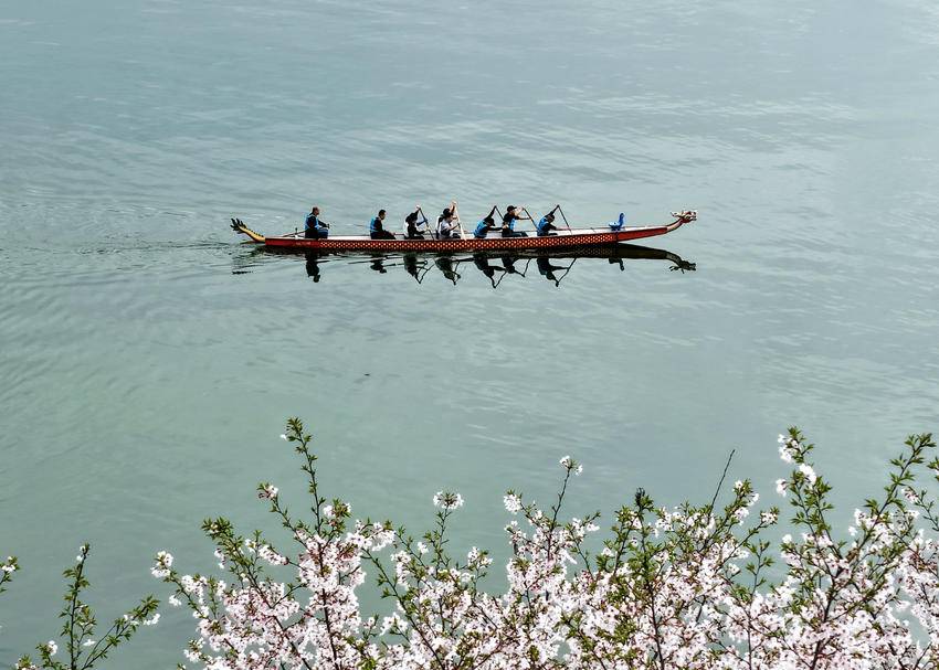3月30日,人们在三峡大坝坝前湖北省秭归县徐家冲港湾水域划龙舟(无人机照片)。