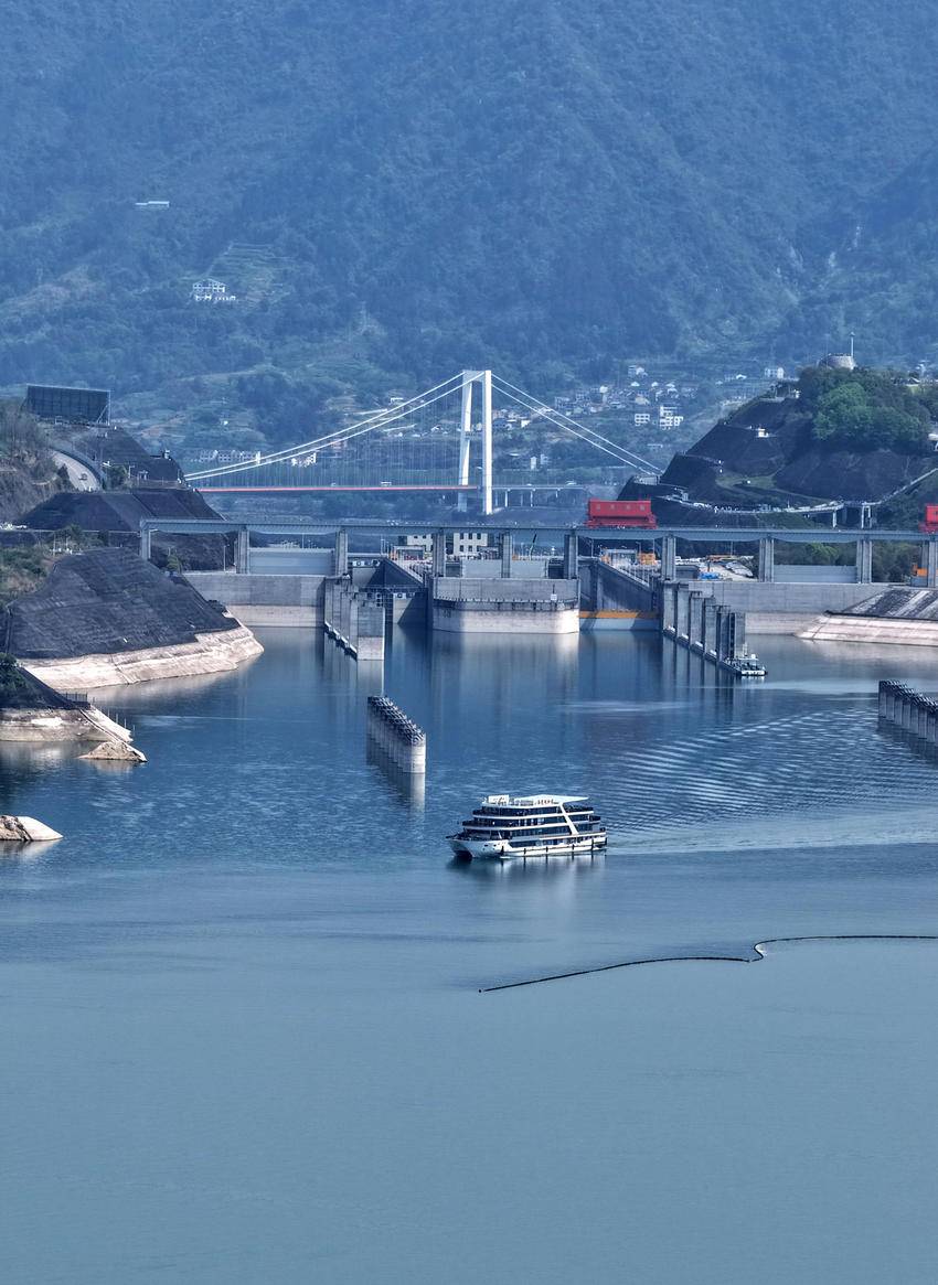 4月3日,在湖北省宜昌市,长江三峡号游轮行驶在三峡大坝坝前水域(无人机照片)。
