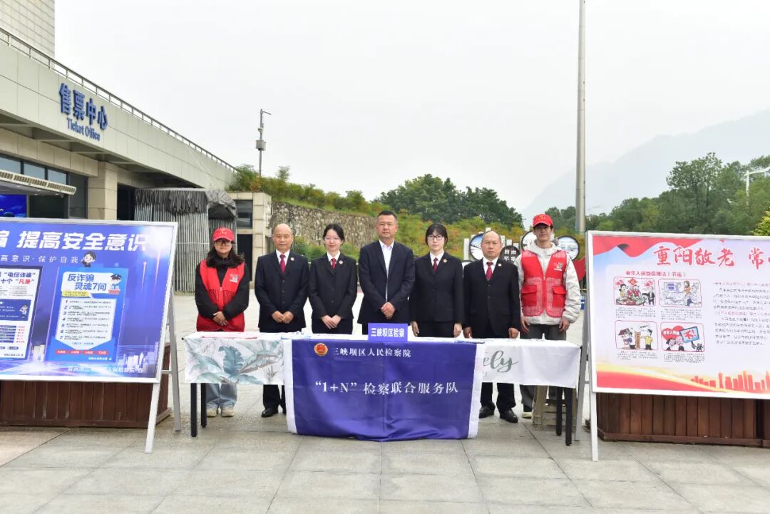 重阳佳节,秋风送爽。在登高望远、敬老爱老的传统文化氛围中,三峡大坝景区迎来了一群特殊的“普法使者”——三峡坝区检察院“1+N”检察联合服务队的干警们走进景区,围绕“防电诈、护权益”主题,在游客入口处搭建起法治宣传阵地,为老年游客送去暖心的“重阳礼”。