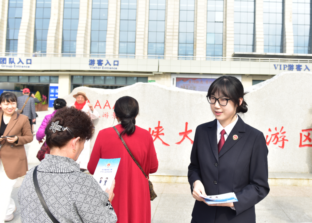 活动现场,检察干警早早在三峡大坝景区游客入口处布置好宣传展台。两张长桌前,“1+N”检察联合服务队的队员们面带微笑,耐心接待每一位前来咨询的游客。一旁的大屏幕上,检察职能介绍和反诈宣传片交替播放,与现场精心布置的两大主题展板共同构成一道鲜明的“法治风景线”。