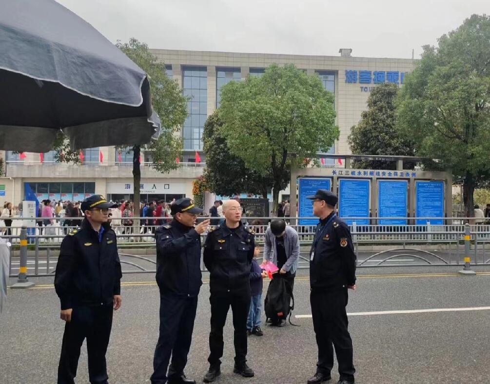 三峡工委为积极有效应对中秋、国庆“双节”旅游高峰,及时召开宜昌市应对2023年“中秋”“十一”黄金周三峡大坝安全保卫工作会议,对游客人数、车辆通行流量、安全隐患等进行研判,科学制定预案,对社会秩序、安全生产、旅游服务、值班值守等各项工作进行了研究部署,明确了各部门职责,细化了具体措施。并在“双节”来临前,组织相关部门开展安全隐患联合检查,对重点部位巡查巡检,现场解决落实存在的问题。节庆期间,综合处6名同志始终坚守在三峡坝区第一线。